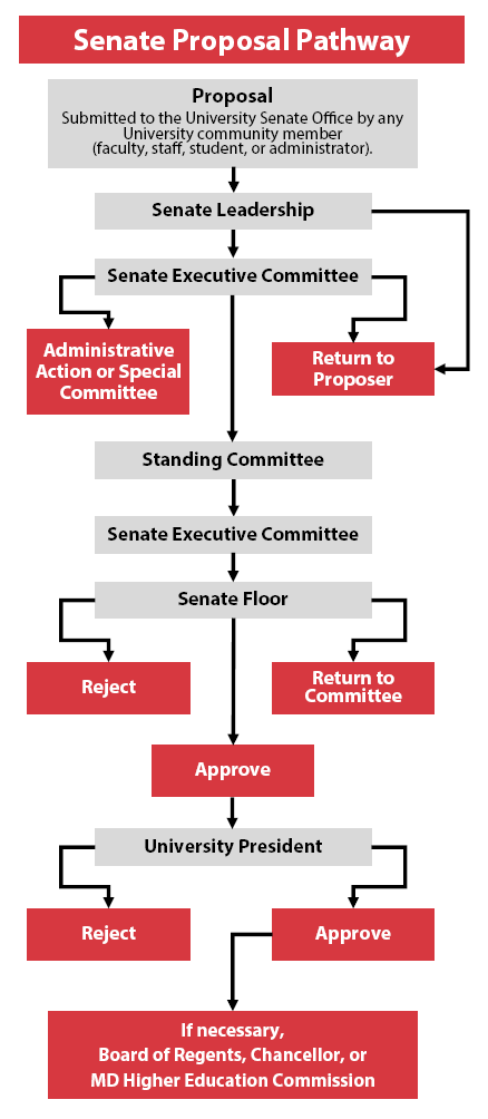 Proposals for policy review can be submitted by any member of the University of Maryland campus. When a proposal is submitted to the University Senate Office, if the proposal is within the purview of the University Senate, it is first sent to be discussed in the Senate Executive Committee (SEC) and then typically sent to a standing committee as a charge. After a full review of the proposal and charge, the standing committee typically submits its report and recommendations to the SEC for placement on the agenda of the full Senate for debate, amendment, and approval.